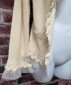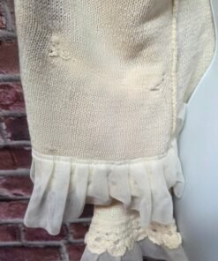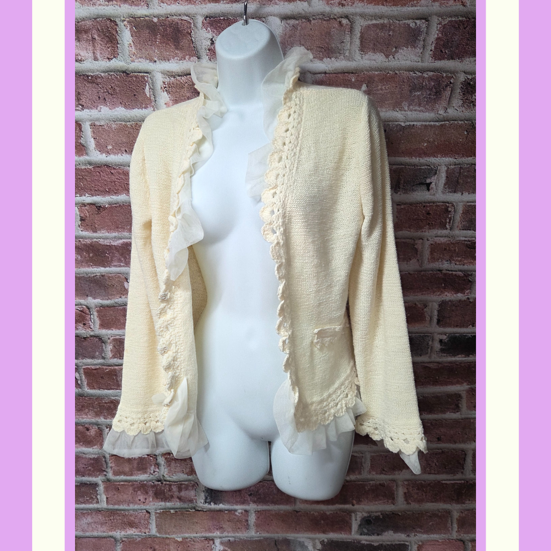 Bring romantic retro vibes to your wardrobe with this dreamy vintage Curio cardigan from the 1980s. Made in Hong Kong, it features a delicate chiffon ruffle trim, open front design, and soft cream knit — perfect for layering into cottagecore, coquette, or quiet luxury looks.