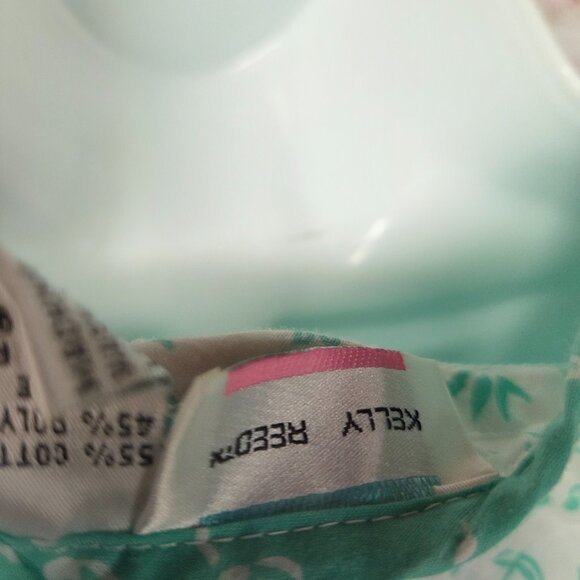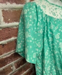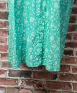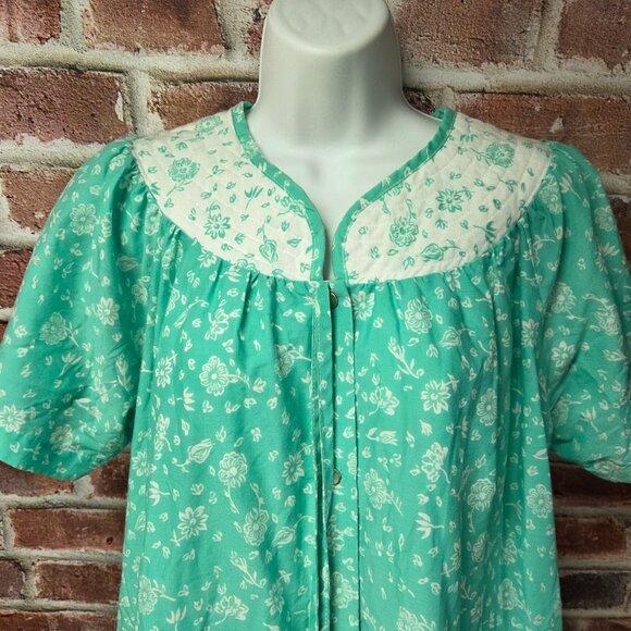 Relax in vintage comfort with this 1980s Kelly Reed teal green house dress. Made in Taiwan R.O.C., it features a button-down front, short sleeves, and convenient side pockets for a blend of practicality and retro charm. The soft cotton-poly blend offers breathable comfort, perfect for lounging or casual everyday wear. A timeless piece of classic vintage loungewear.